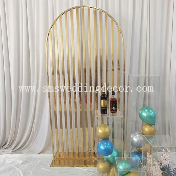 Le cadre de fond de fête mesure environ 1 mètre de large et 2 mètres de haut, en acier inoxydable et plaqué or. Cette arche a une base autoportante, une feuille d'acier inoxydable, qui est très solide. Le support de toile de fond en acier inoxydable est composé de nombreuses bandes d'acier inoxydable, aux lignes fluides.