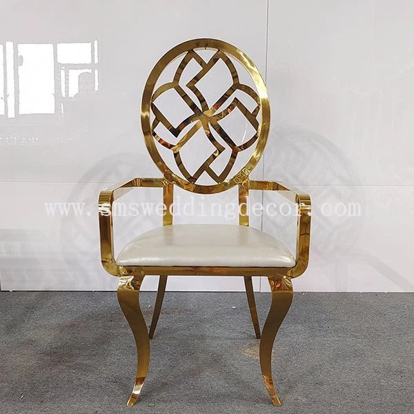 Cette chaise de banquet en acier inoxydable est une chaise à double accoudoirs. Il est fait d'acier inoxydable et de cuir. Comme vous pouvez le voir, l'ensemble de la chaise a une belle finition brillante. L'acier inoxydable est plaqué de couleur or par procédé de galvanoplastie, la couleur est uniforme et ne se décolore pas, ne se décolore pas et ne tombe pas.
